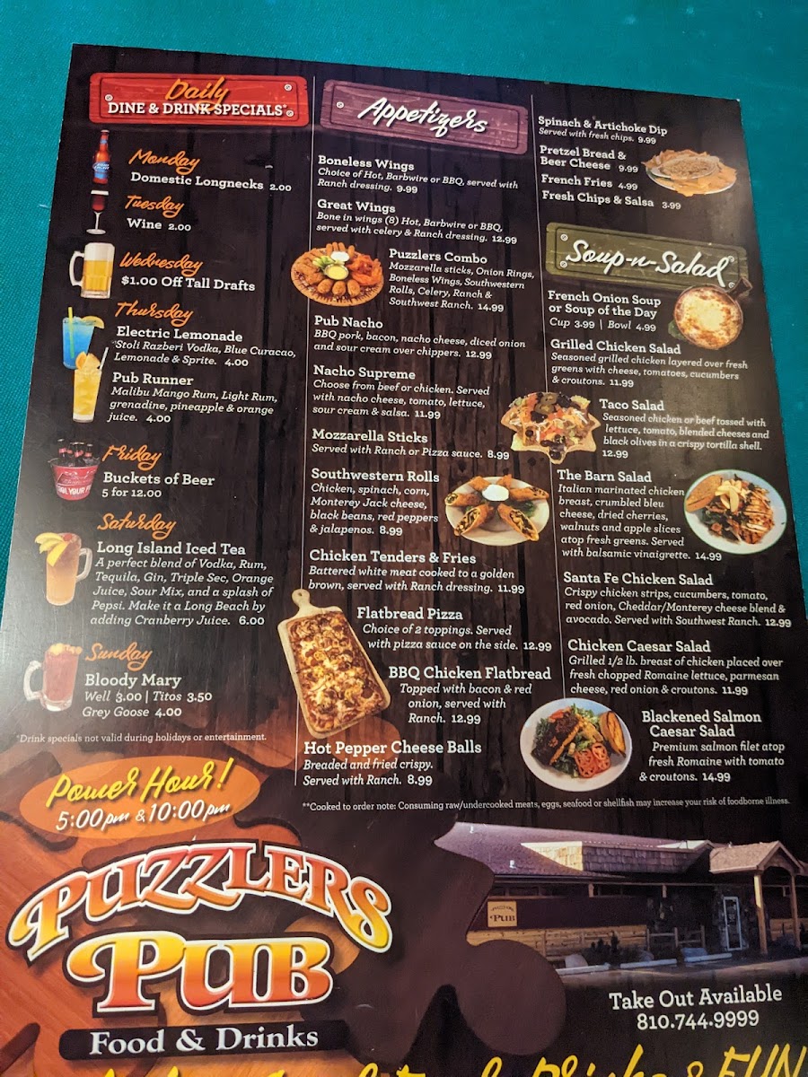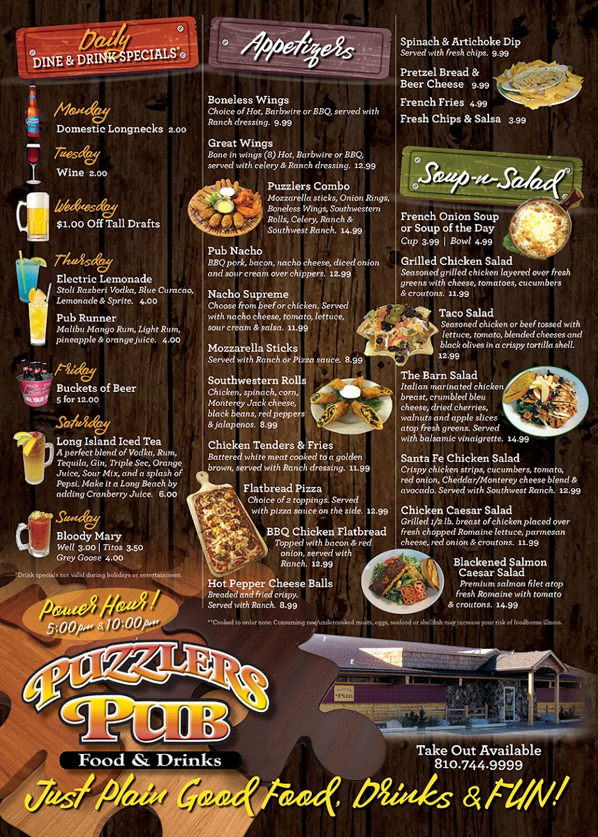 Welcome to Puzzlers Pub, a hidden gem located in Burton, MI, where a warm atmosphere meets an irresistible menu. The experience starts with the friendly staff, who ensure your visit is enjoyable from the moment you walk in. The menu is a delightful blend of classic pub fare and comfort food, perfect for all ages. Dive into the Kids Menu, featuring favorites like cheeseburgers and chicken tenders, or explore the diverse Sandwiches & Wraps section, highlighted by the mouthwatering Prime Rib Panini and Buffalo Chicken Wrap.